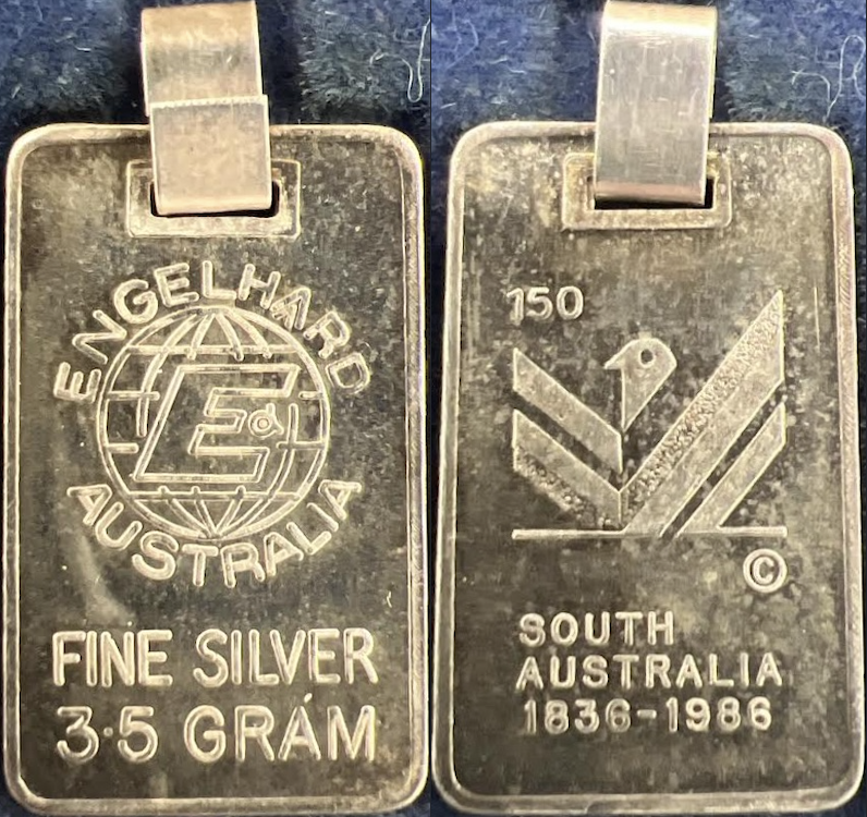 ![]() | 3.5g | Small ‘E’ Logo | MC Absent | [150] [Custom South Australia Logo] [SOUTH AUSTRALIA][1835-1985] | [ENGELHARD AUSTRALIA] [Engelhard Small ‘E’ Globe Logo] [FINE SILVER] [3.5 GRAM] | 3.5 gram pendant produced by Engelhard, Australia. Issued in a commemorative 150 year Jubilee collector box, pictured below.![]() | Serial Absent | <25MINTAGE |