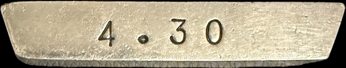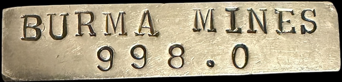 ![]() ![]() | [BURMA MINES] [999•7] | [Burma Corporation Ltd] [April 1923] | 4.18oz ingot Produced by Burma Corporation, Ltd. This ingot measures 3″ x 7/16” and weighs 129.89 grams. | <10 |