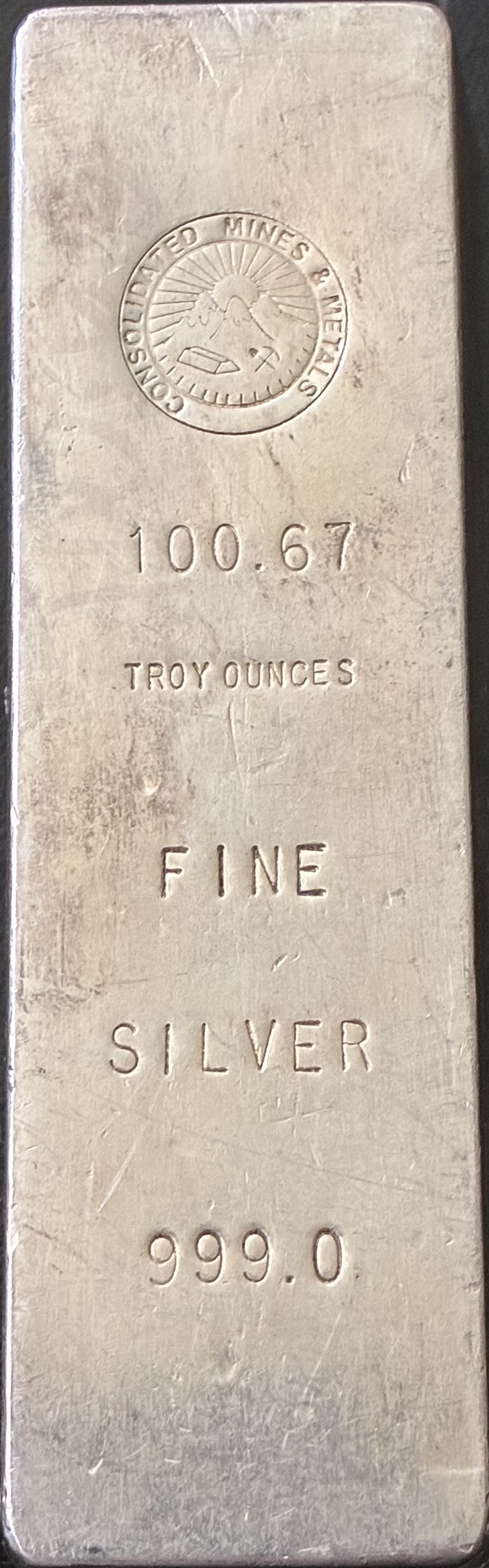 | [CONSOLIDATED MINES & METALS] [CUSTOM COMPANY LOGO] [Weight Designation] [FINE SILVER] [999.0] | Blank | 100oz class ingot produced by Consolidated Mines & Metals of San Francisco, California. | Serial Absent | <100 |