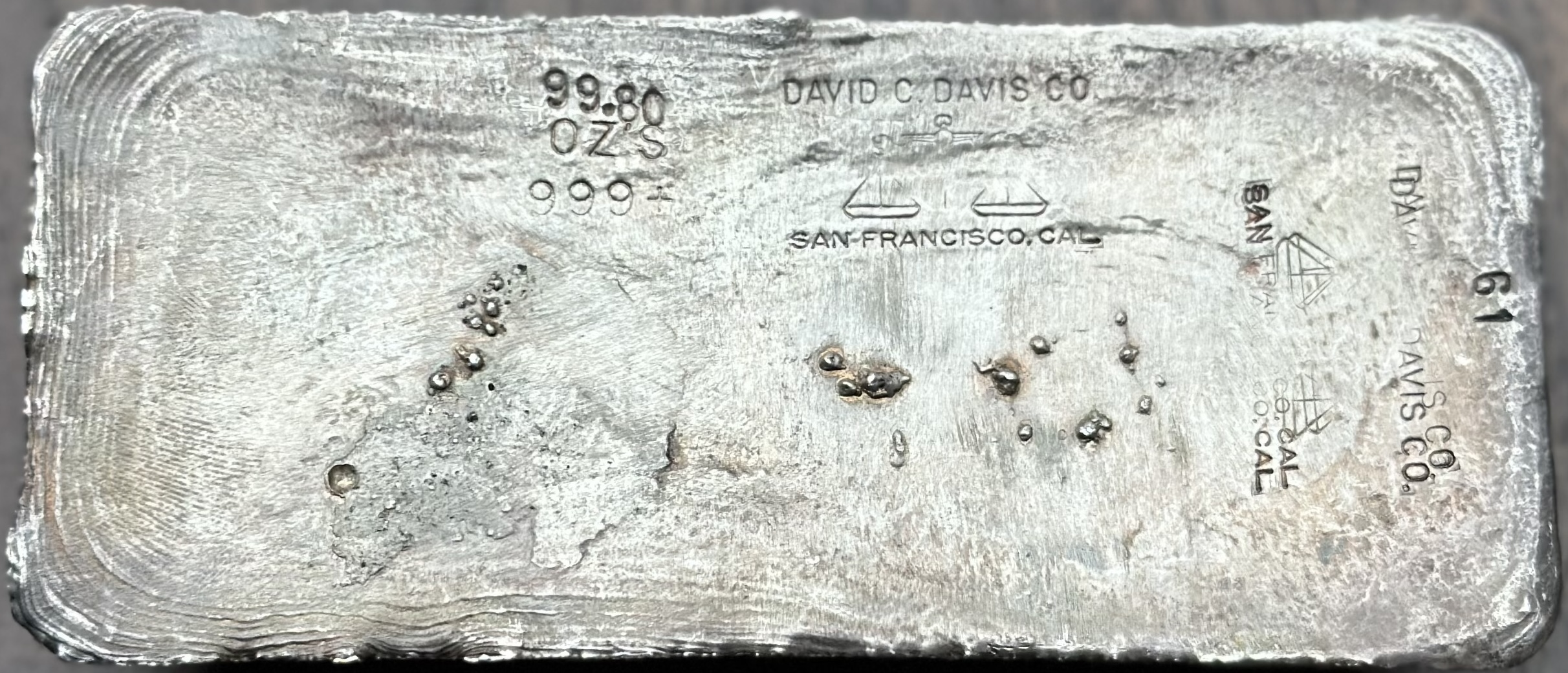 IMG_7766IMG_7768IMG_7769IMG_7770[DAVID C. DAVIS CO.] [ASSAY SCALE LOGO] [SAN FRANCISCO, CAL] [Serial Number] [DAVID C. DAVIS CO.] [ASSAY SCALE LOGO] [SAN FRANCISCO, CAL] [99.80] [OZ’S] [999+]Cast Finish100oz class ingot produced by David C. Davis Company of San Francisco, California.  Unique example, only 100oz class ingot known to demonstrate two hallmarks.611