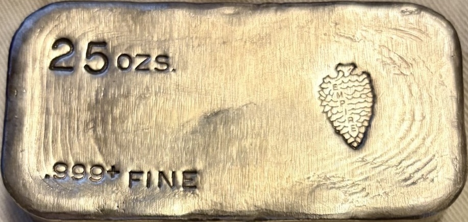 | [.999+ FINE] [SILVER] [25 OZS. TROY] [Empire International Acorn Hallmark] | Cast Finish | 25oz class ingot produced by Empire International, Inc. Similar to our above examples, this variety includes the ‘TROY’ stamp | <25 |