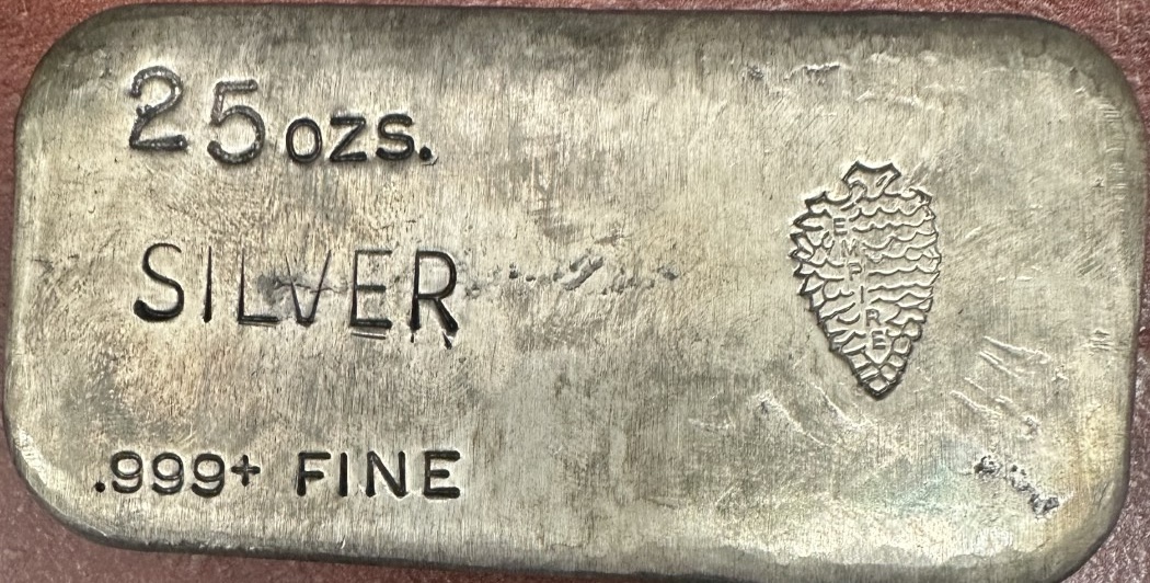 | [25 OZS.] [Empire International Acorn Hallmark] [.999+ FINE SILVER] | Cast Finish | 25oz class ingot produced by Empire International, Inc. Similar to our above examples, this variety includes the ‘FINE SILVER’ stamp | <25 |