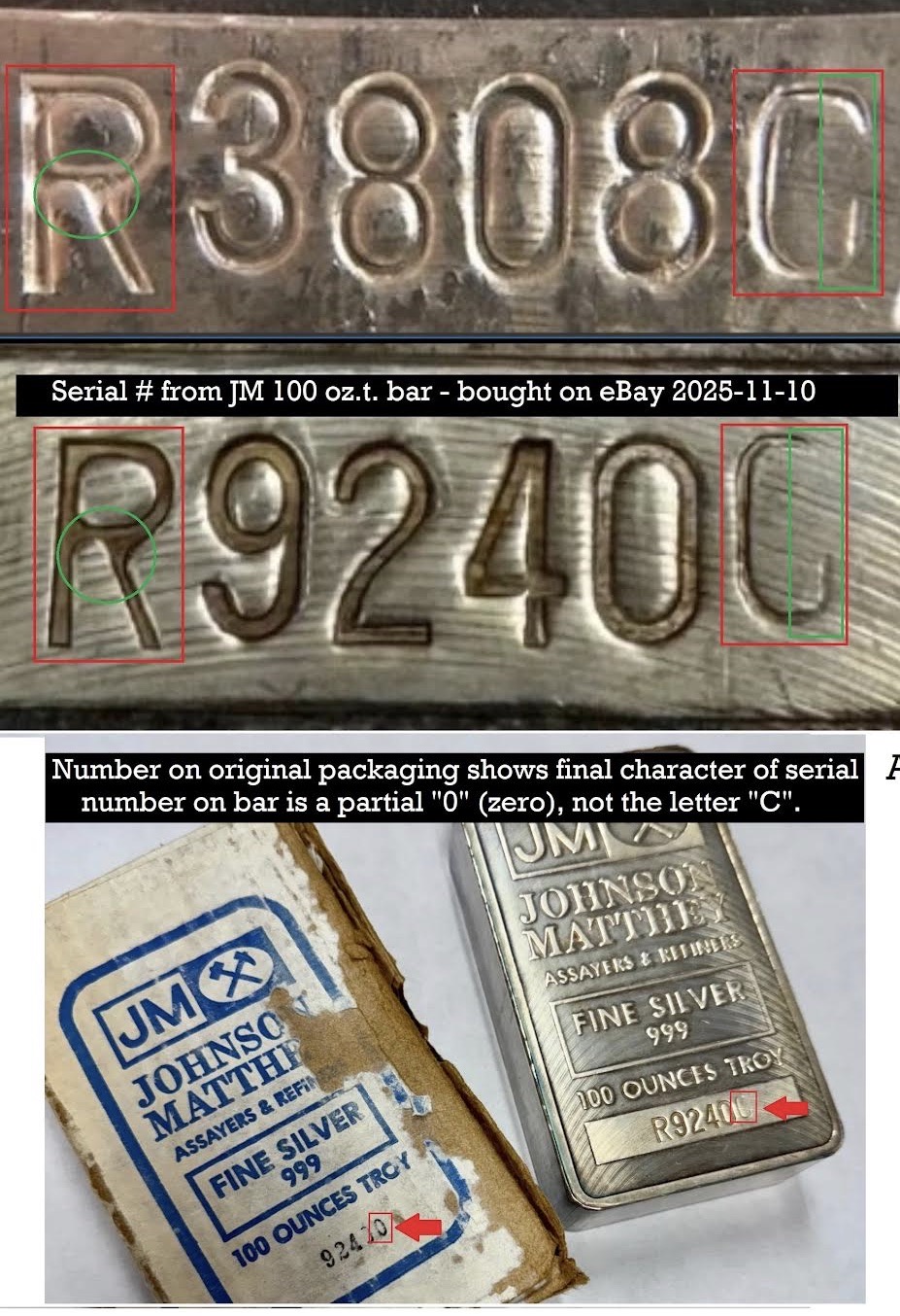 | 100oz | [JOHNSON MATTHEY] [Diamond JM Logo with Crossed Hammers] [Serial Number Sideways on Left] [100+ OZ] [999+] [JMRI. ASSAY OFFICE Oval Logo] [USA Inner Oval] | Cast Finish | 100oz example produced by Johnson Matthey, Canada. Similar to our above example, though demonstrates a unique ‘USA’ smaller oval hallmark at the bottom vs. the standard ‘JM LTD. ASSAY OFFICE’ as seen above. Also note the serial number stamping anomaly, also pictured below.