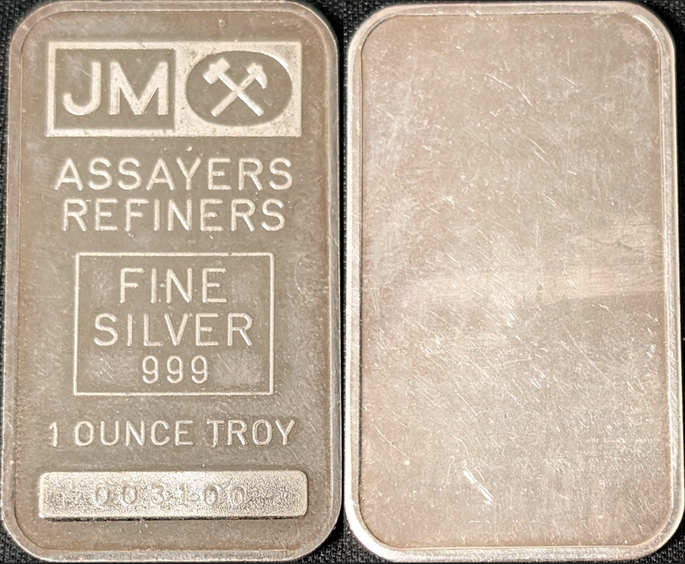 ![]() | 1oz | [JM Crossed Hammers Logo] [Johnson Matthey] [one ounce troy] [999 FINE SILVER BULLION] [Serial Number] | [JM Crossed Hammers Logo Repeated Fifteen Full Times] | 1oz example produced by Johnson Matthey & Mallory Limited, London. Similar to our example above, but demonstrates a thinner and less bold font, most easily observed by the letter ‘B’ in ‘BULLION’. | 000100 | <50 |