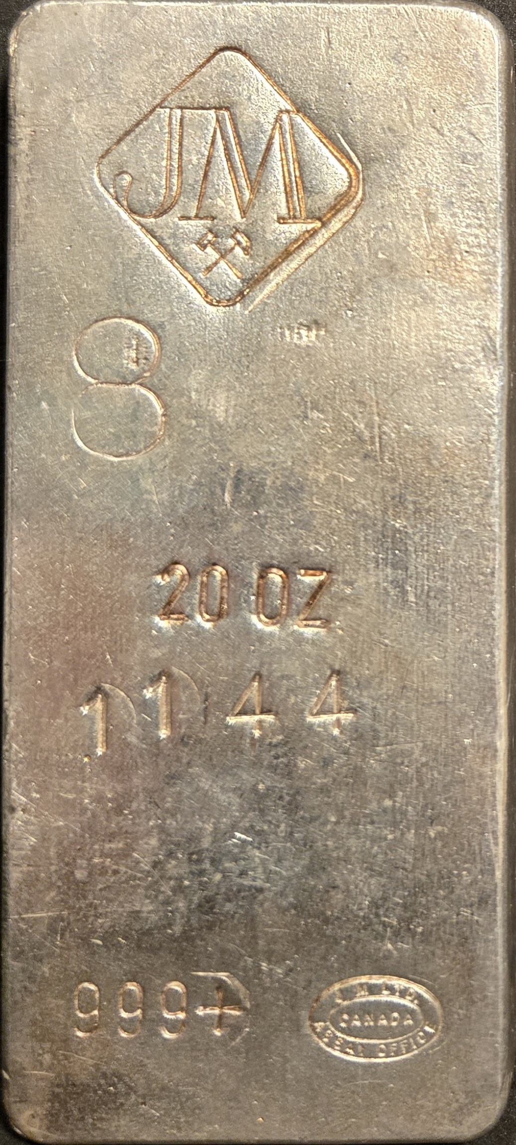| 20oz | [Diamond JM Logo with Crossed Hammers] [Number 8 Below Diamond Logo] [20 OZ.TR] [CANADA Inner Oval] [JM LTD. ASSAY OFFICE Oval Logo] [999+] | Cast Finish | 20oz example produced by Johnson Matthey, Canada. This example is noteworthy in that it demonstrates a serial number and the unique Number 8 stamp. | 1123 1139 | <25 |
