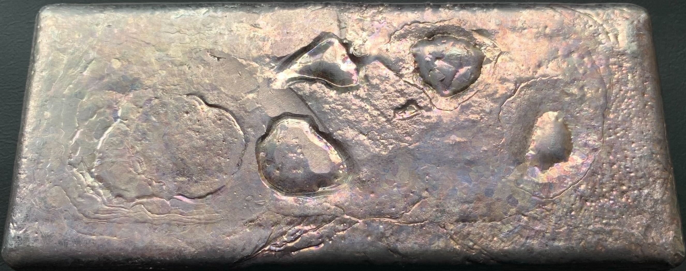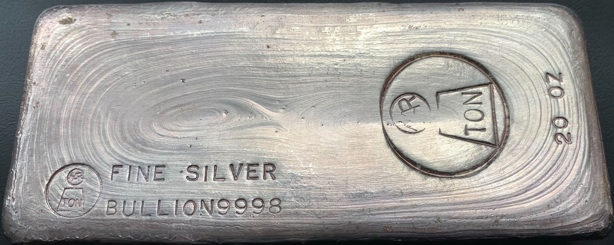 ![]() | 5oz | [Harringtons Circular Logo] [SSILVER] [BBUULLLLIONN] [9999988888] [5.OZ.] | Cast Finish | 5oz ingot produced by Harringtons. This example demonstrates an enthusiastic application of obverse stampings, one known example. This ingot sold via eBay Auction for $3,502.24 on August 4, 2025. | Serial Absent | 1 |