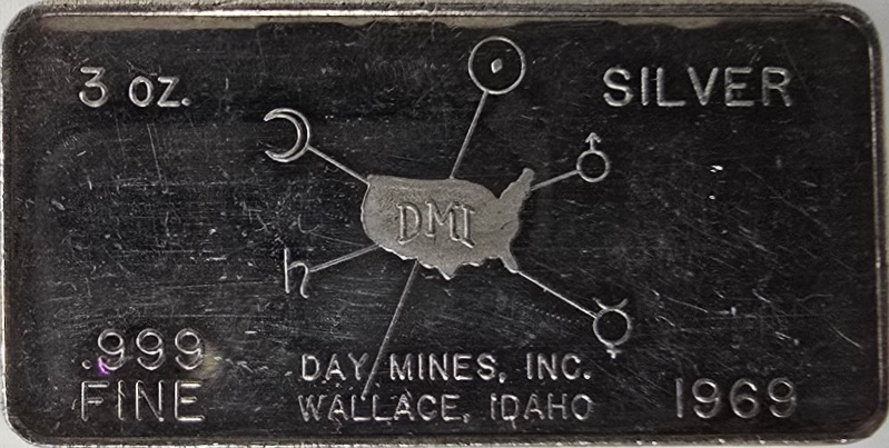 | 3oz | [Foster ‘Type 2′ Hallmark] [.999+] [SILVER] [3 OZ.] | [GREEN CO.] [Deak Perera Triangle Hallmark] [L.A. CAL] [DEAK] | 3oz class ‘Type 2′ hallmark ingot produced by W. H. Foster, Inc. Very unique example that includes the Deak Perera triangle, ‘GREEN CO. L.A. CAL’ stamping and ‘DEAK’ on the reverse. | N/A | <25 |