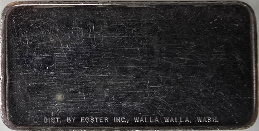 | 3oz | [Foster ‘Type 1′ Hallmark] [.999] [SILVER] [3] | Flat Machined Finish | Pressed 3oz class ‘Type 1′ example produced by W. H. Foster, Inc. Note the varied placement of the weight designation stamp. | N/A | <1,000 |