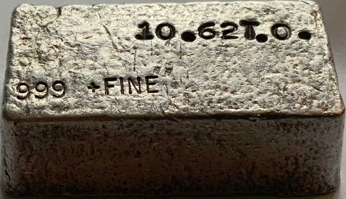 | [10.62 T. O.] [999 + FINE] | Cast Finish | 10oz class ingot produced by Western States Refining of Fontana, California. This variation lacks the ‘WSR’ hallmark stamp. | <25 |